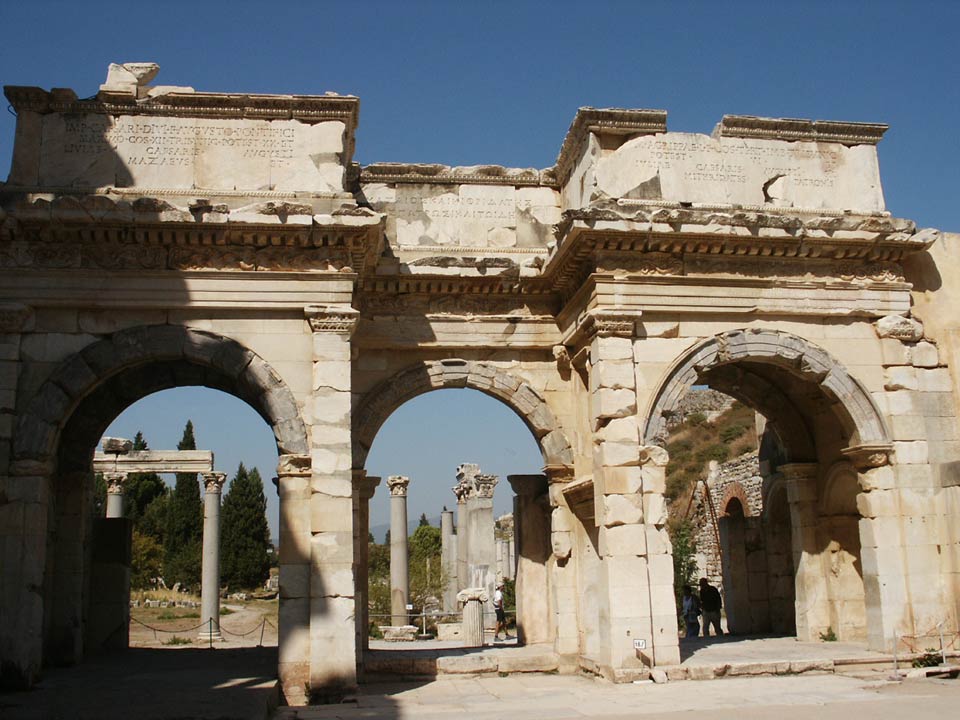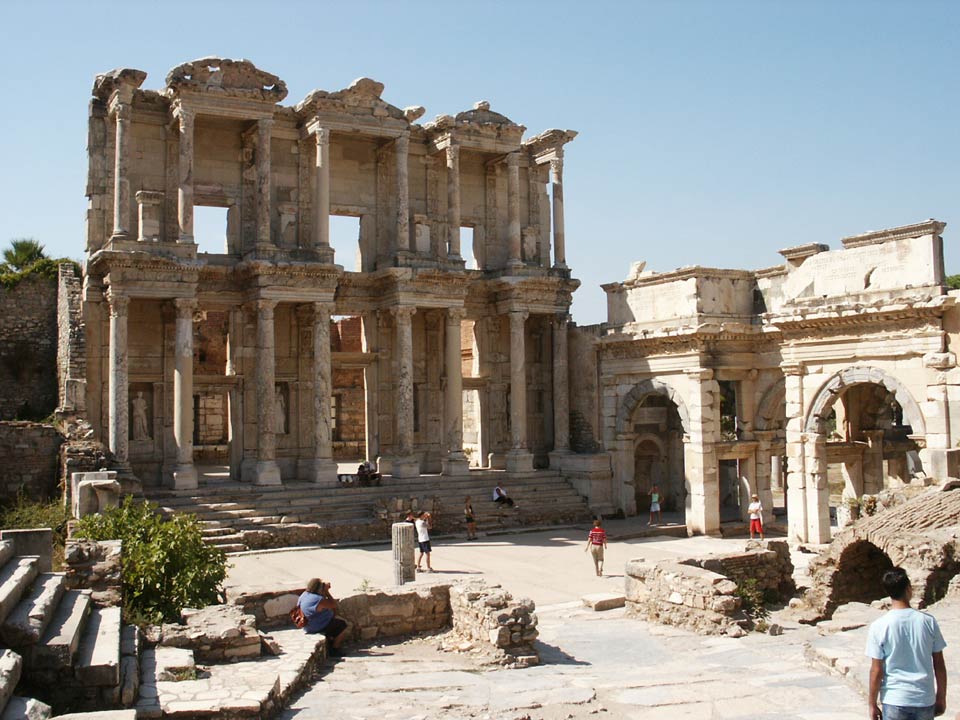 Some of the most famous ruins, the front of the Library of Ephesus with the Mithridates gate to the right.